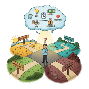 - Résultat : Cette approche crée une boucle de « chercher sans trouver ». Plus vous cherchez à l’extérieur ce qui vous manque, plus vous vous sentez distant de la solution. Vous ne réalisez pas que vos compétences transférables, vos passions, vos expériences de vie, et votre capacité à apprendre rapidement (qui sont « en vous ») sont déjà des éléments essentiels de la solution pour opérer un changement de carrière. Vous ajoutez des étapes, des certifications, des années d’études, repoussant ainsi la solution au lieu de la reconnaître en vous.
