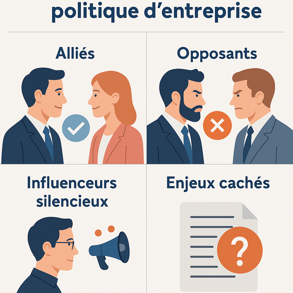 L’identification des alliés passe par l’observation de leurs prises de position, l’analyse de leurs projets et la compréhension de leurs enjeux personnels. Un directeur commercial soutenant l’innovation produit peut devenir un allié précieux pour un chef de projet R&D. Un responsable RH défendant la transformation digitale peut s’allier avec un responsable IT dans une démarche de modernisation.