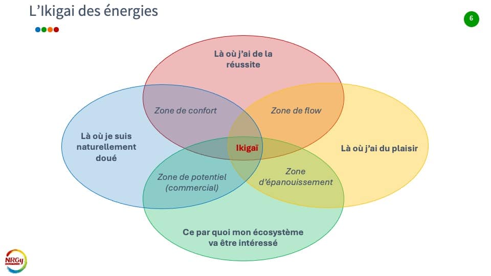 Le modèle Ikigai a été revisité en collectif autour de 4 cercles spécifiques : Réussite, Plaisir, Talent Naturel, Résonance Écosystémique. Cet outil de coaching d’équipe favorise l’alignement, la clarification des rôles et redynamise les missions en mettant en lumière les complémentarités et les aspirations partagées.