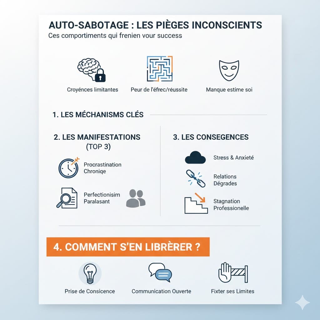 Les études récentes (Psychological Science 2025) identifient les leviers les plus fréquents de ce sabotage de carrière :