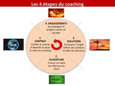 Le coach aide à mobiliser vos ressources en modélisant des expériences passées positives et en transformant le problème en opportunités d’action. Il ne cherche pas à analyser en profondeur les causes, mais à vous conduire vers des pistes concrètes de changement.